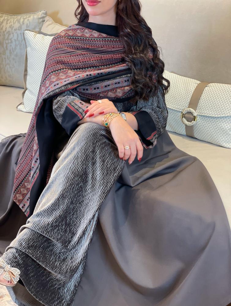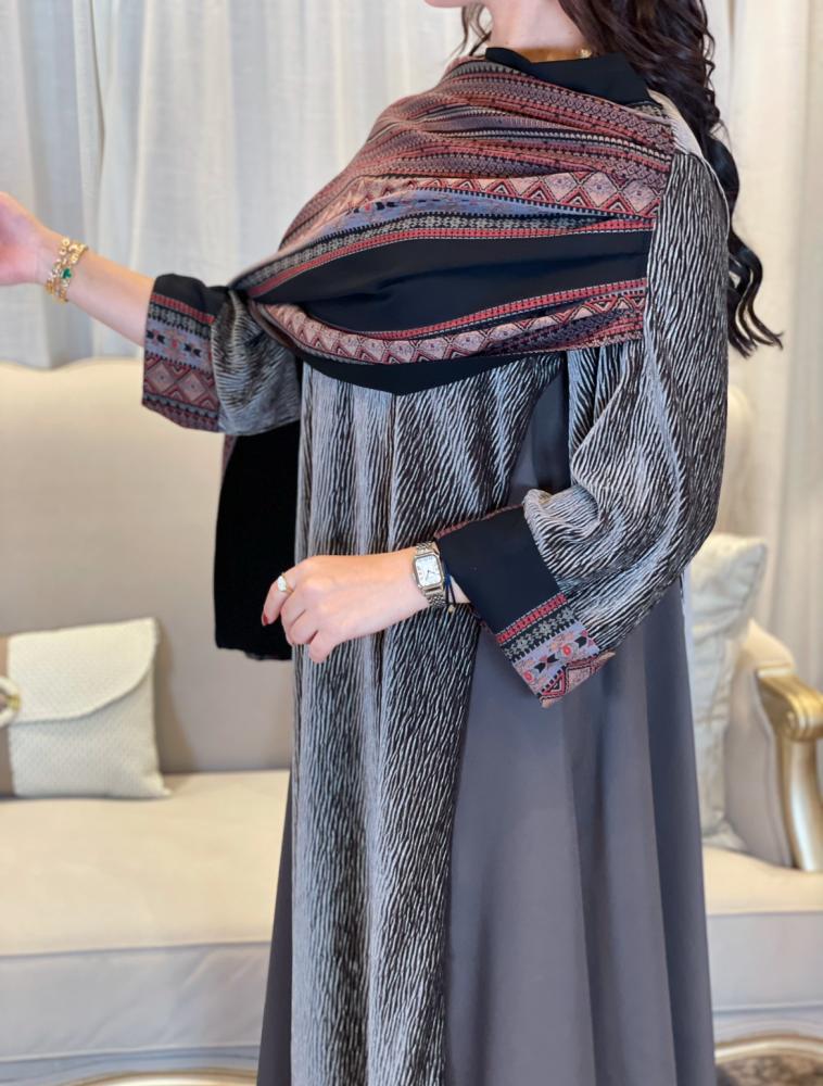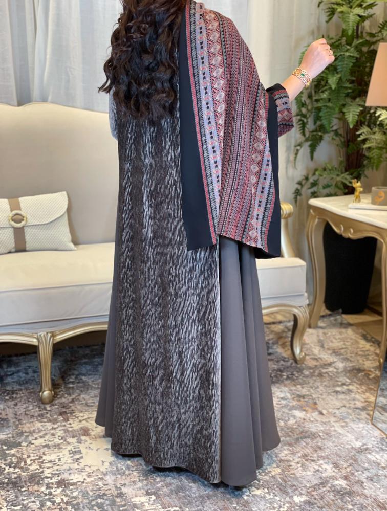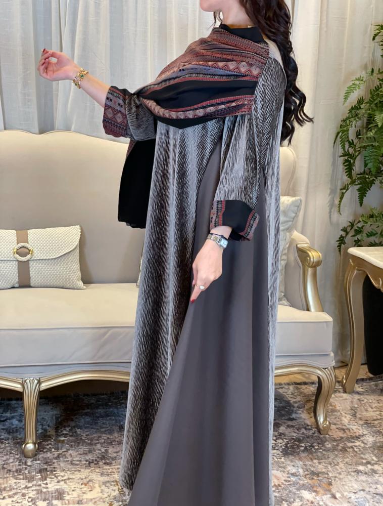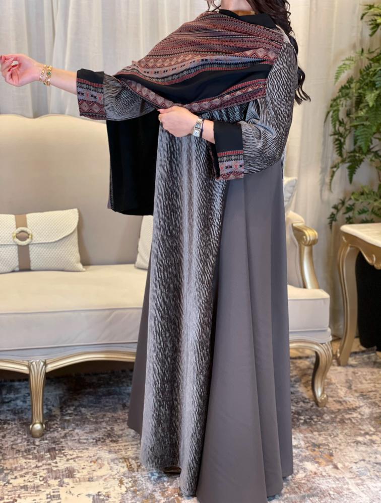 ٤٩٠جلابية فاخرة شتوية مكونة من ثلاث ألوان وخامات متناغمة المخمل المجعد الراقي المنسدل مع مع كتان بالاطراف قصة كلوش كامل وشال كشميري بالوان هادئة ومحببة للنفس متصل بالقطعة مبطن بشيفون اسود باكمام منتهية بنفس القماش الكشمير قطعة ذات طابع دافئ شتوي يزين سهراتك وحضورك المميز بالليالي الشتوية بالمناسبات