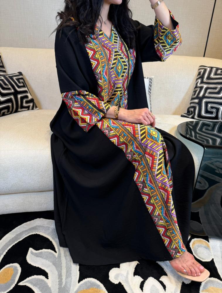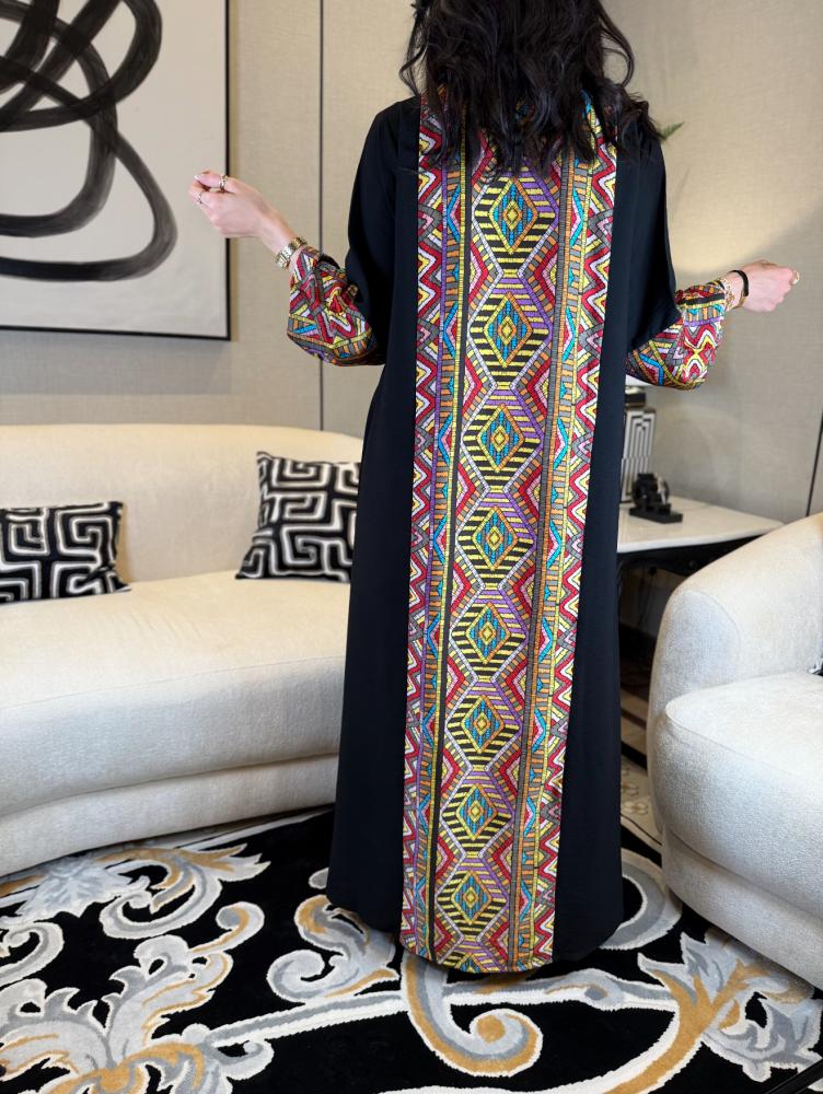 جلابية أسود ملونة بالوسط بالوان زاهية