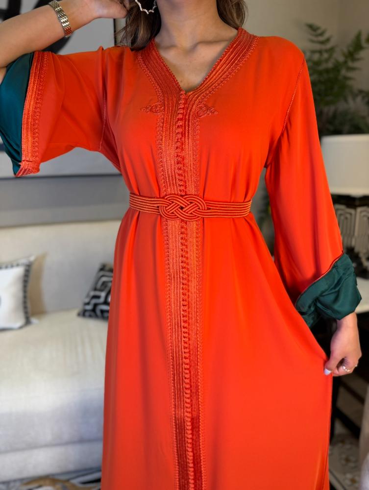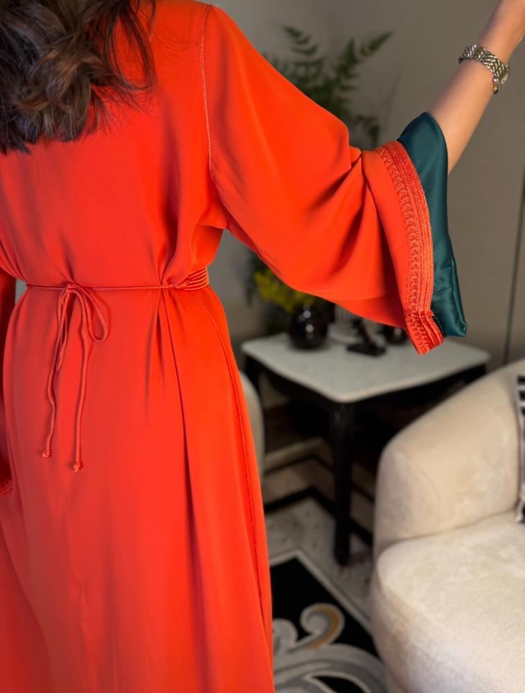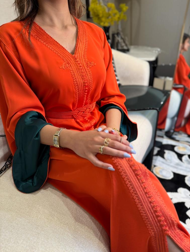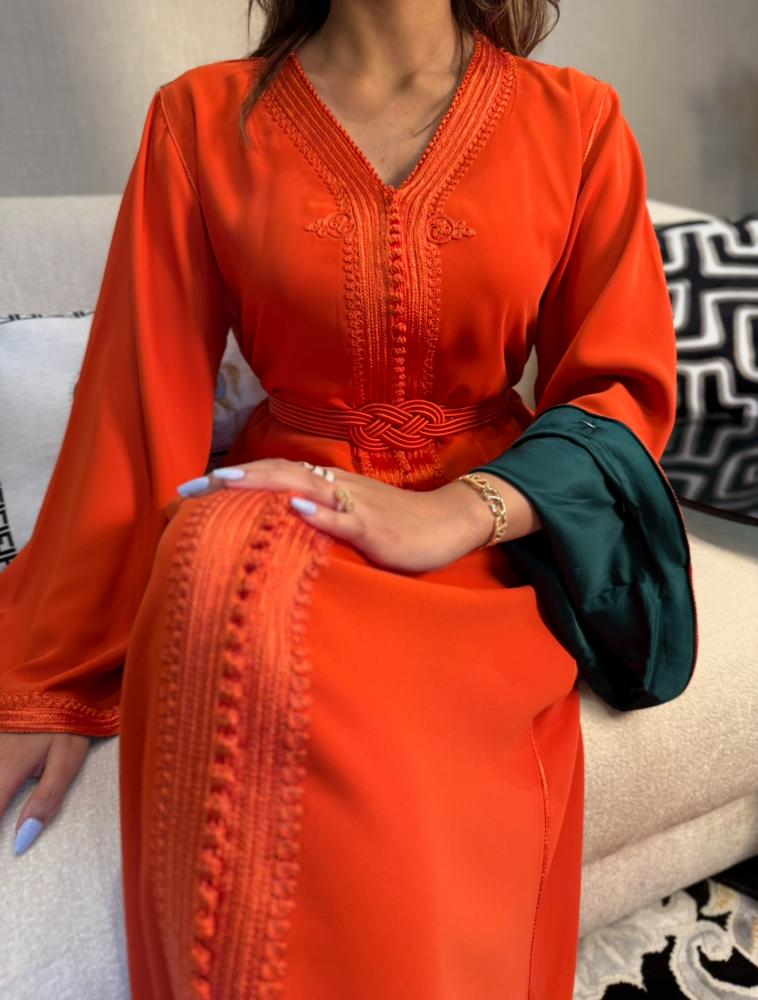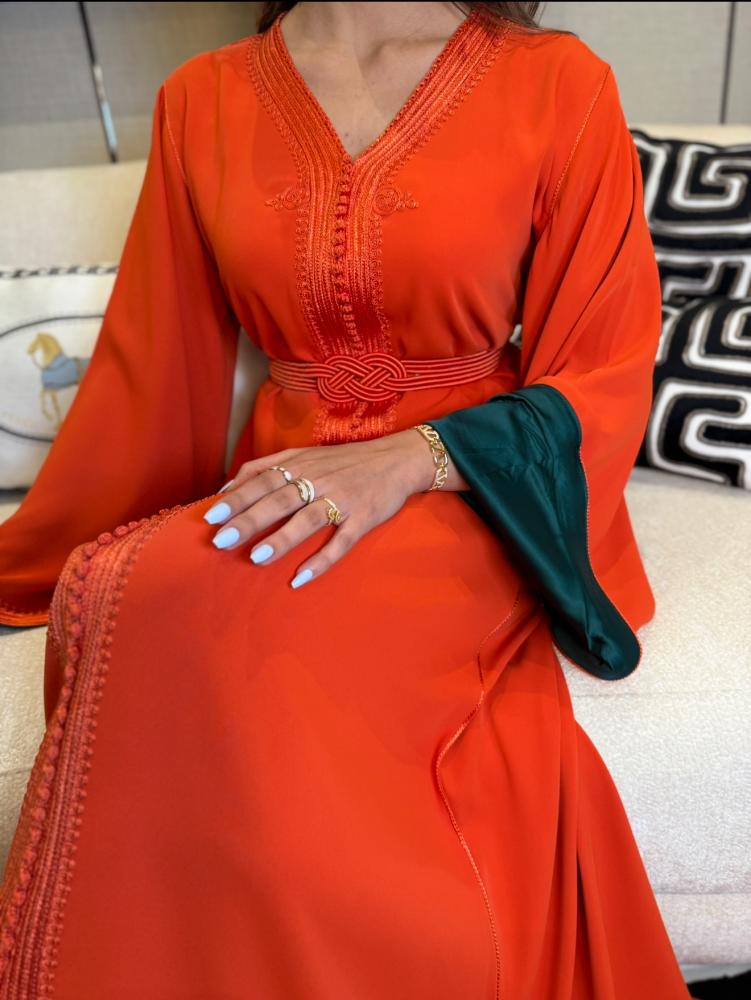 قفطان مغربي فخم جداً كريب درجة اولى صيفي مطرز بتطريز من نفس اللون مع تبطين للاكمام بلون يكسر اللون الاساسي قطعة مميزة جداً وراقية لهذا الزي التقليدي الفاخر من نوعة ستلاحظين بان القطعة محاكة بعناية قصوى بدايتاً بالتفصيل والخامة ونهايتاً بالتطريز