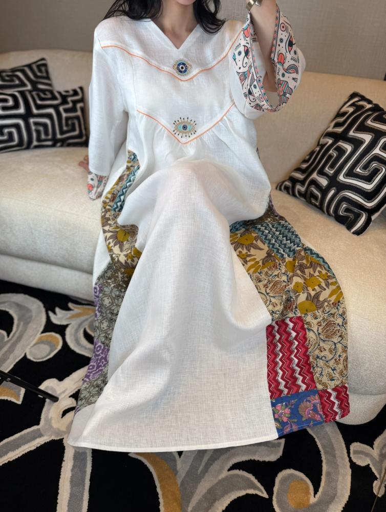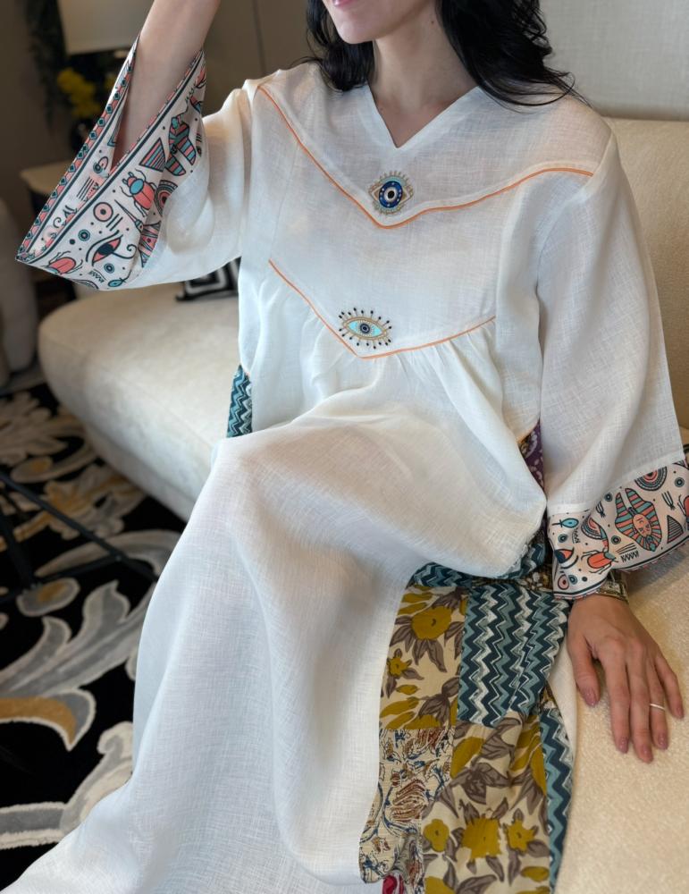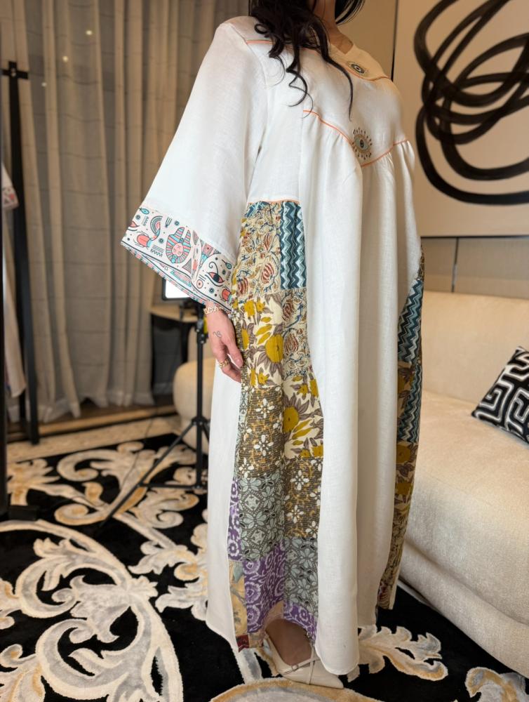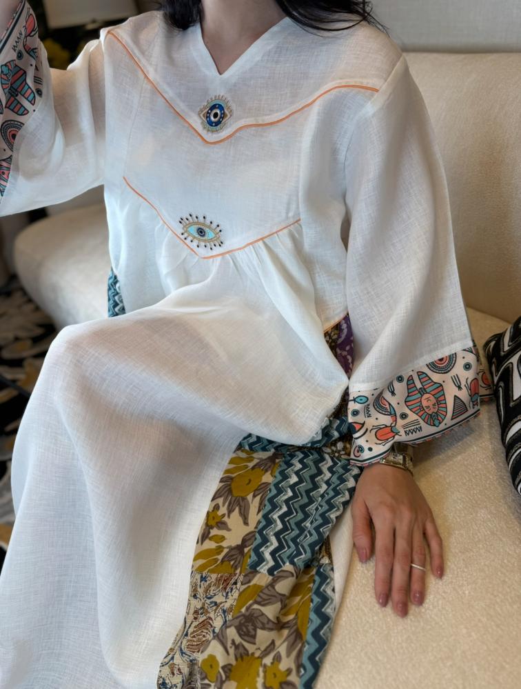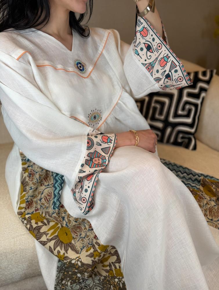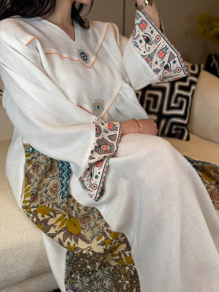 جلابية راقية ونفس الوقت بسيطة ومحببة للنفس بطراز فرعوني مبتكر موضحة بالخامات المستعملة موزعة بطريقة فنية بالقطعة ابتدائاً بالخامة المستعملة لنن هندي وتدخيلات من الطابع الفرعوني لتكوني اول من يقتني قطعة مميزة بعناصرها الجميلة مستوحى من الفن الفرعوني المتمازجة مع طابع جلابياتنا الخليجية المميز لتظهر لك قطعة نادرة وخارجة عن المالوف بعالم الجلابيات ومؤكدين جمالها بالخام المضاف بالاكمام قطن مطبوع برسومات فرعونية والجانبين مربعات قطن ١٠٠٪ محاكة بطريقة راقية ومميزة