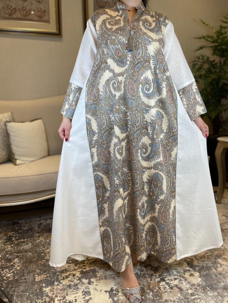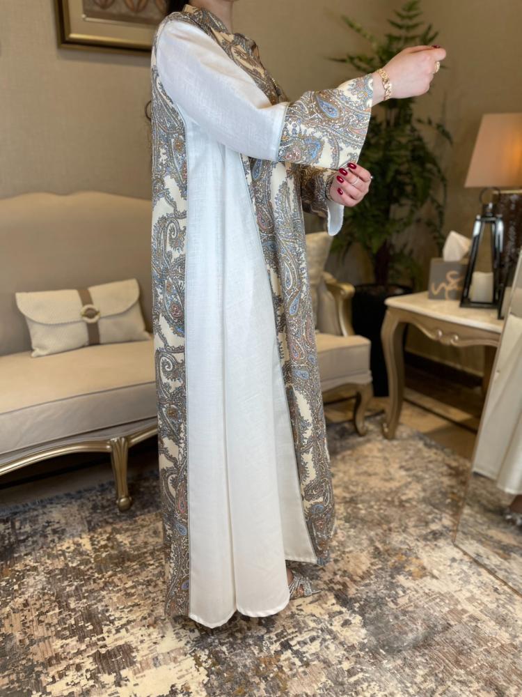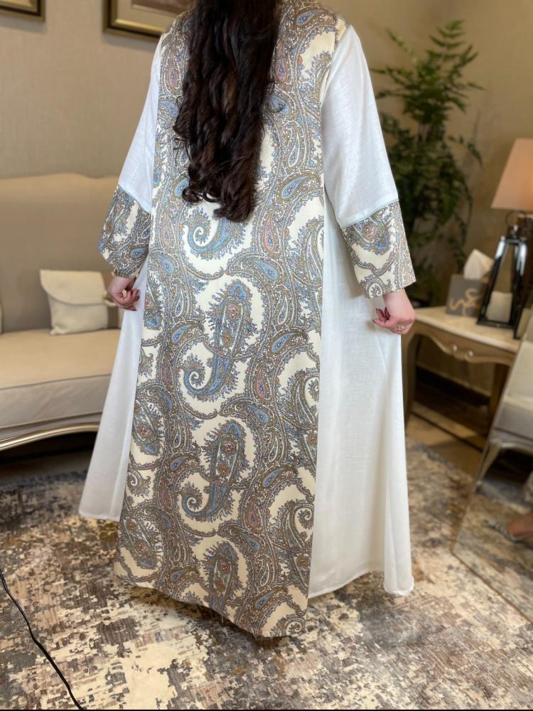 ٤٥٠جلابية فاخرة جداً محببة للنفس بالوان متناسقة الخامات عبارة عن لنن طبيعي هندي سادة وبالوسط والاكمام نقشة الربيانة كريب فاخر جداً مبطنة بشيفون فيتامي بارد مزينة بدندوشة مصممة خصيصاً لهذا الموديل بقصة واسعة نصف كلوش متوفر منها مقاسين موحدة
