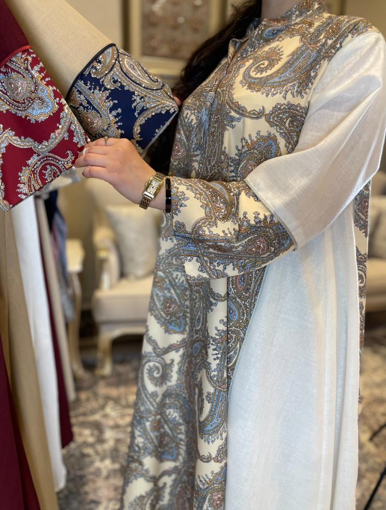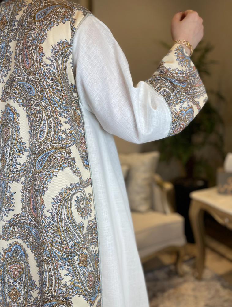 جلابية لنن بنقشة ربيانة اوف وايت سماوي