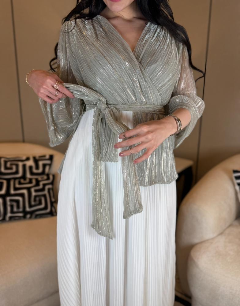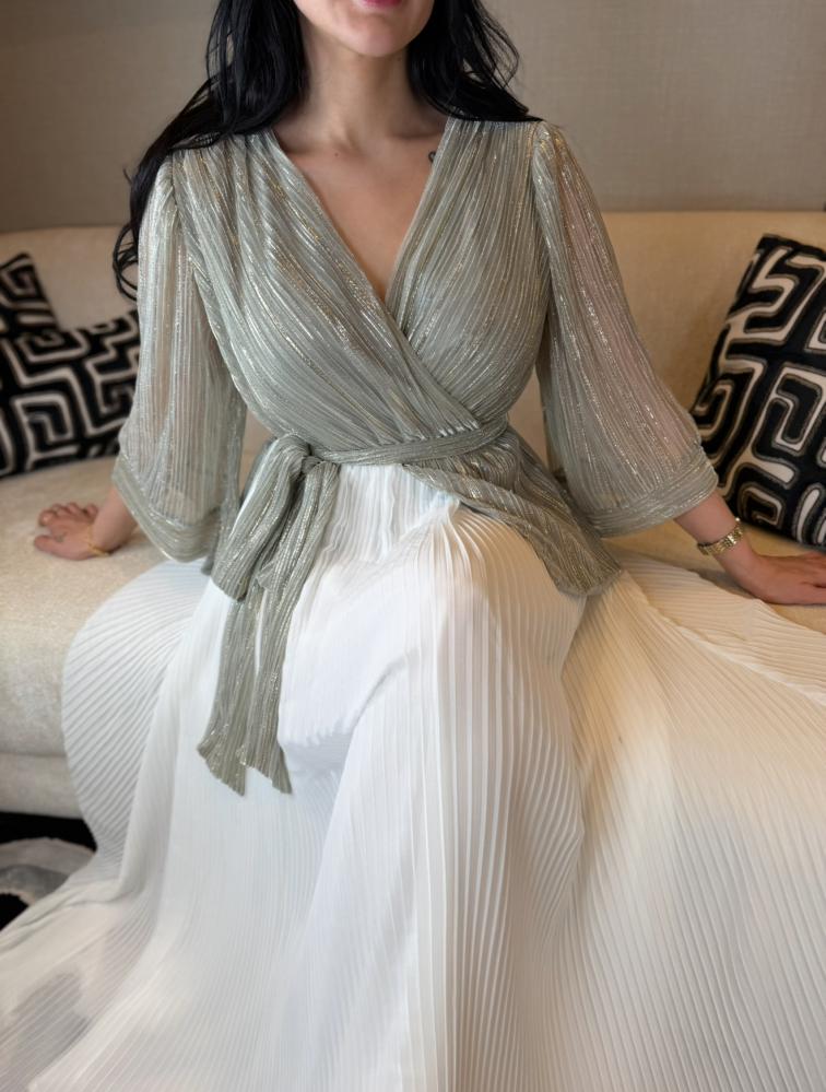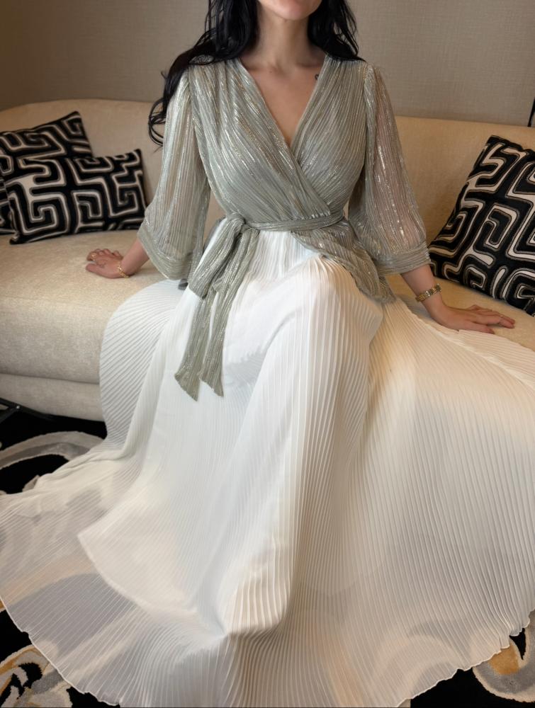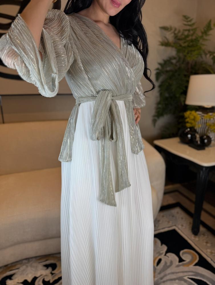 فستان سهرة انيق لون اوف وايت ذهبي ورمادي مشرق